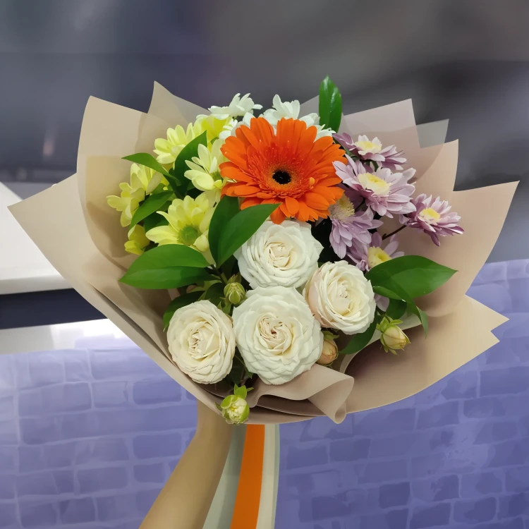 Букет "Грация лета" - прекрасное сочетание роскошных роз, нежных гербер и изысканных хризантем, окутанных крафтовой упаковкой. Этот букет является идеальным изображением гармонии и красоты. Розы символизируют страсть и любовь, герберы - радость и свежесть, а хризантемы - благополучие и долголетие. Композиция нежных лепестков, создающая эффектный контраст и скрытую глубину, заставляет сердца замирать от их изысканной красоты и величия.